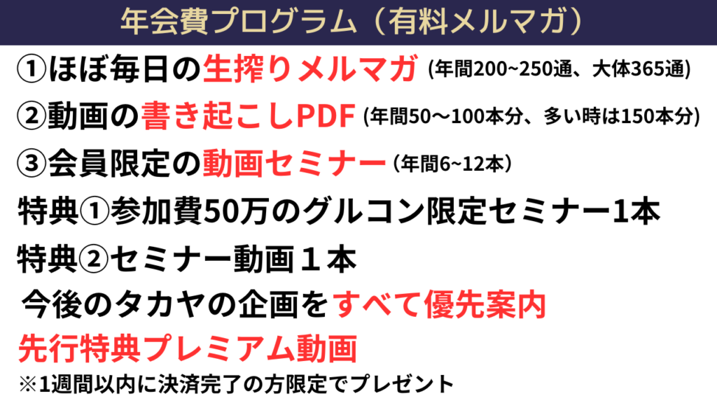 まとめると、年会費プログラム(有料メルマガ)では、