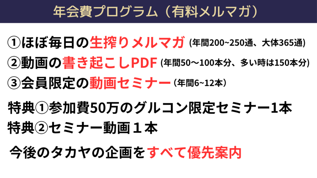まとめると、年会費プログラム(有料メルマガ)では、