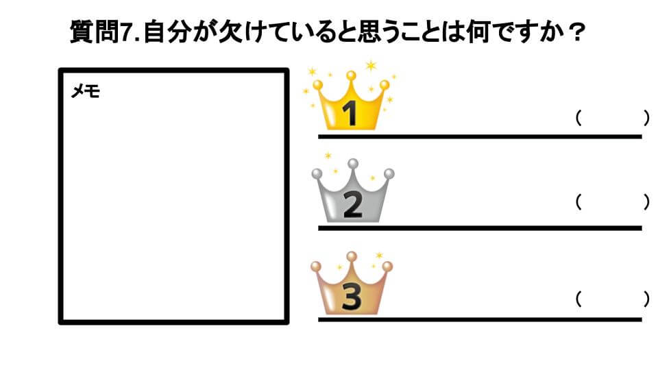 書けたら、自分が欠けていると思うことの中で特に欠けていると思うことを1位・2位・3位と書き出してみてください。